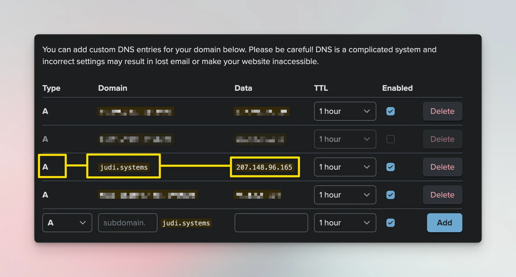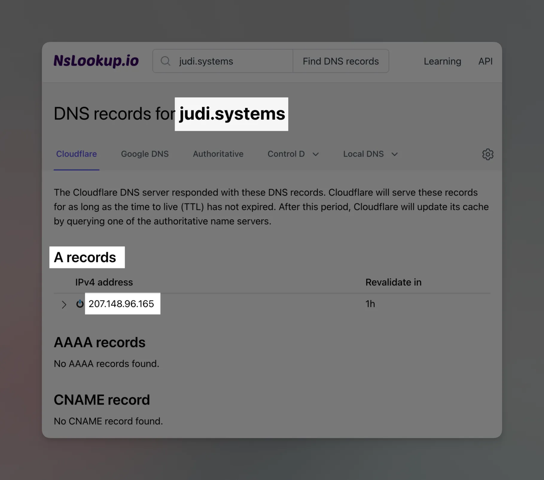 For the domain judi.systems, I have a DNS record of type A that map it to 207.148.96.165.