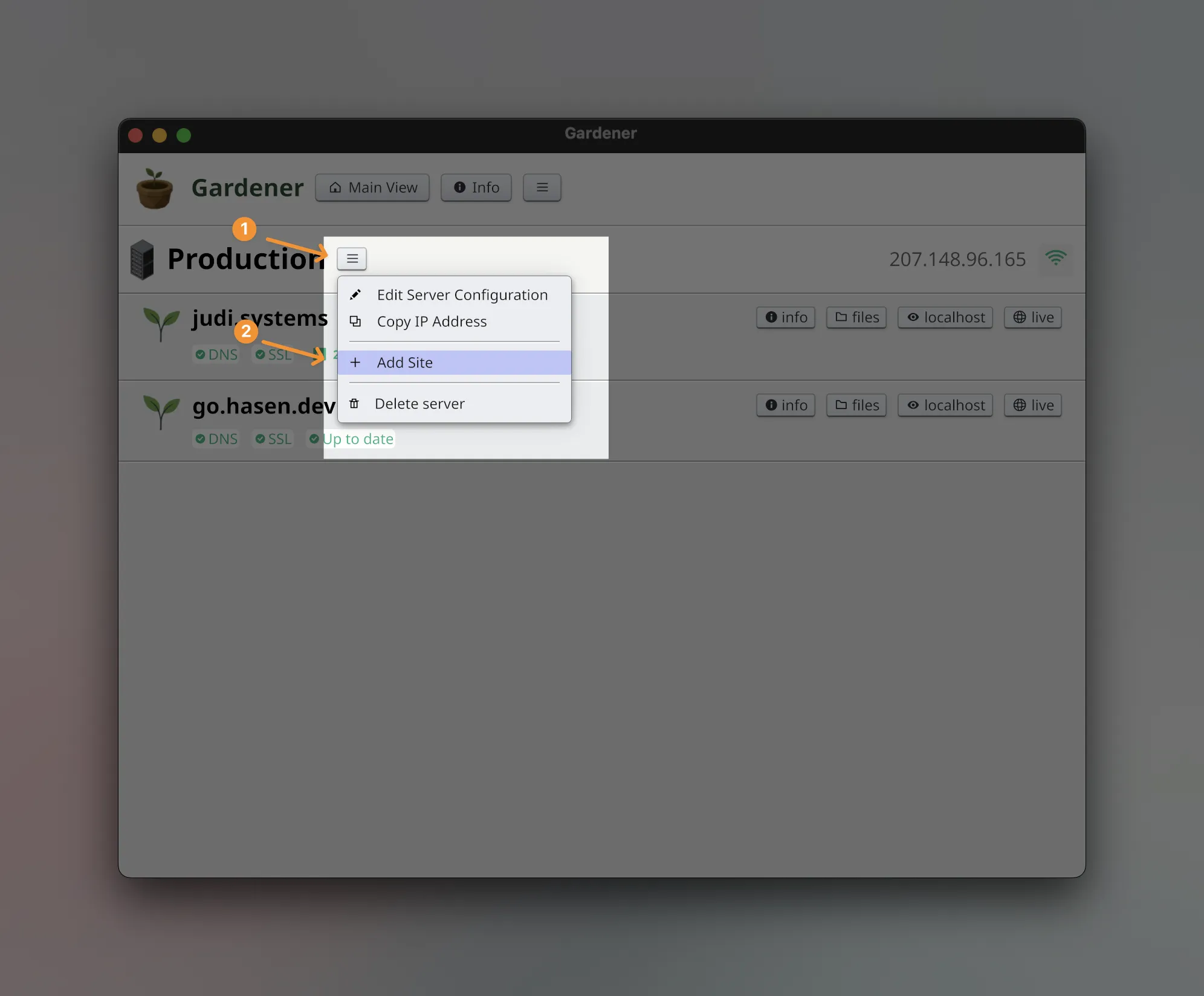 To publish a new website to the internet using Gardener, we start by creating a website under the server entry.